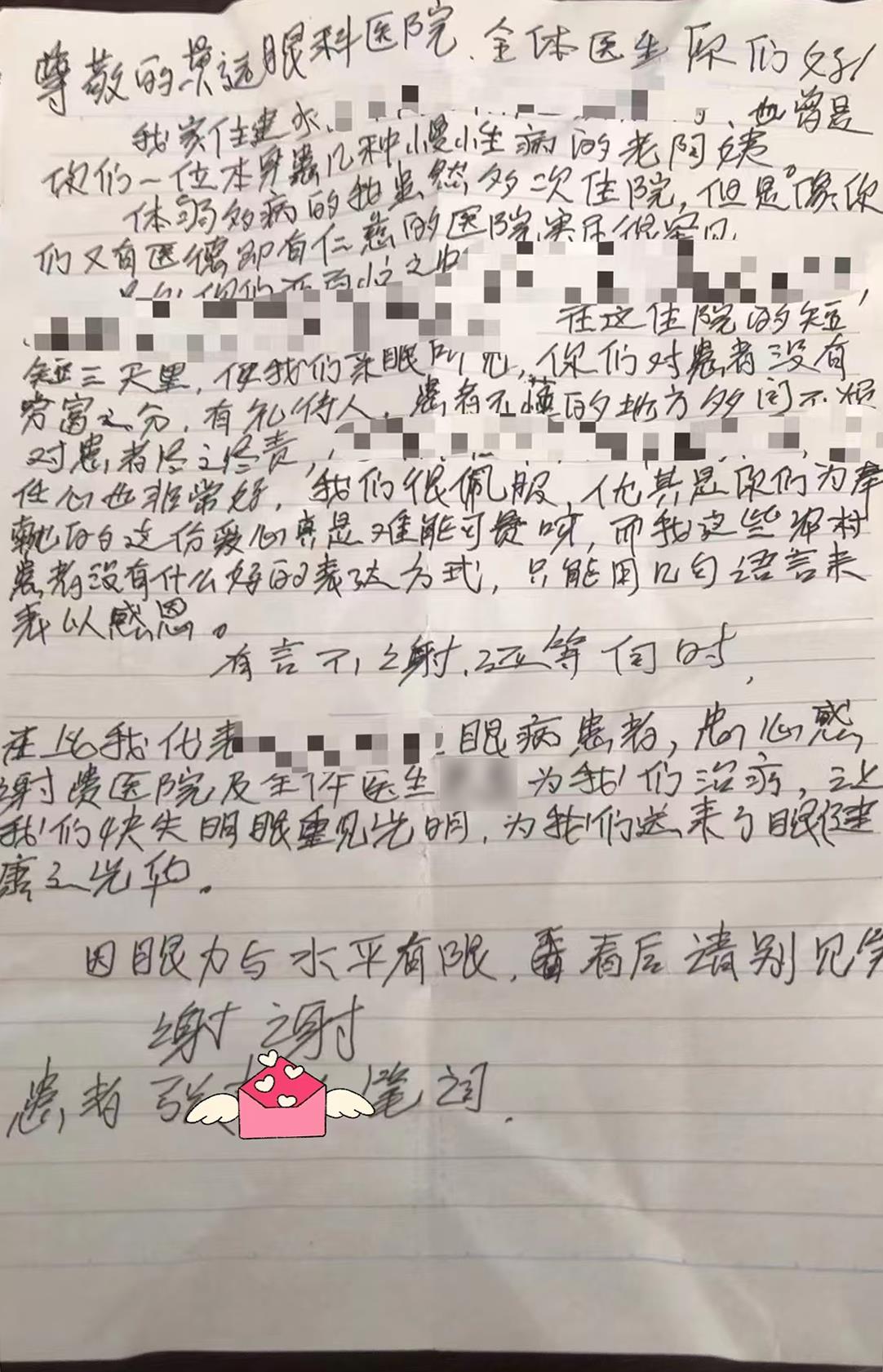 在信中,张阿姨对景远眼科的医疗团队和医院整体服务表示认可和感谢,短短三日住院,体验到了医术精湛与服务贴心。医生专业,护士细心,环境舒适,关怀备至。医院以患者为本,让她深感温暖与安心。